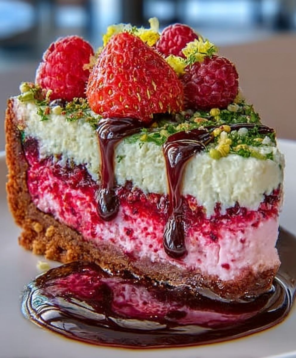 The Grand Arrival of Elegant Pistachio Raspberry Crunch Cheesecake