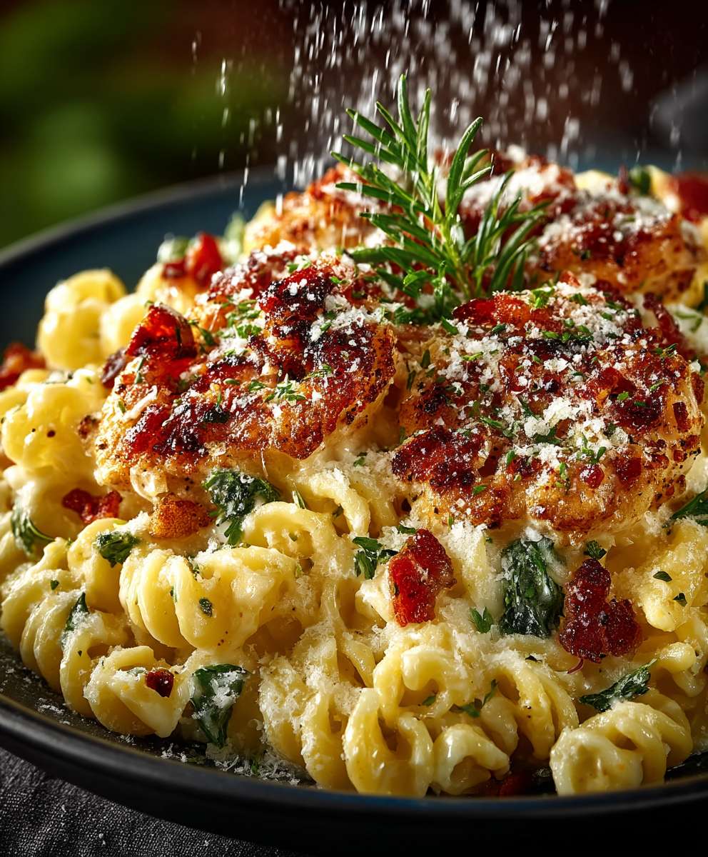 Follow these simple steps to prepare this delicious dish: Step 1: Préparer le poulet et les pâtes Commencez par cuire les pâtes selon les instructions du paquet jusqu’à ce qu’elles soient al dente. Pendant ce temps, coupez la poitrine de poulet en dés et assaisonnez-la généreusement de sel et de poivre. Step 2: Dorer le poulet Dans une grande poêle ou une cocotte, chauffez l’huile d’olive à feu moyen-vif. Ajoutez le poulet en dés et faites-le dorer de tous les côtés jusqu’à ce qu’il soit bien cuit et légèrement caramélisé, cela prendra environ 5 à 7 minutes. Retirez le poulet de la poêle et réservez. Step 3: Créer la base de la sauce à l’ail Dans la même poêle, réduisez le feu à moyen et ajoutez un peu plus d’huile si nécessaire. Incorporez l’ail haché et faites-le revenir pendant environ 1 minute, jusqu’à ce qu’il soit parfumé mais sans le laisser brûler. Step 4: Assembler la sauce crémeuse Versez le bouillon de poulet ou de légumes dans la poêle et portez à frémissement, en raclant les sucs de cuisson au fond de la poêle pour déglacer. Ajoutez ensuite la crème légère et laissez mijoter doucement pendant 2 à 3 minutes, jusqu’à ce que la sauce épaississe légèrement. Step 5: Incorporer le parmesan et les légumes Retirez la poêle du feu et incorporez progressivement le fromage Parmesan râpé, en remuant constamment jusqu’à ce qu’il soit complètement fondu et que la sauce soit lisse. Ajoutez les épinards frais et les tomates cerises coupées en deux, en mélangeant jusqu’à ce que les épinards soient juste fanés. Step 6: Finaliser et servir Réintroduisez le poulet cuit dans la poêle avec les pâtes égouttées. Mélangez délicatement pour bien enrober tous les ingrédients de sauce. Goûtez et ajustez l’assaisonnement si nécessaire avec du sel et du poivre. Transférez dans des bols, garnissez de persil frais haché et servez immédiatement pour une expérience gustative réconfortante et pleine de saveurs.