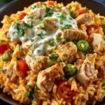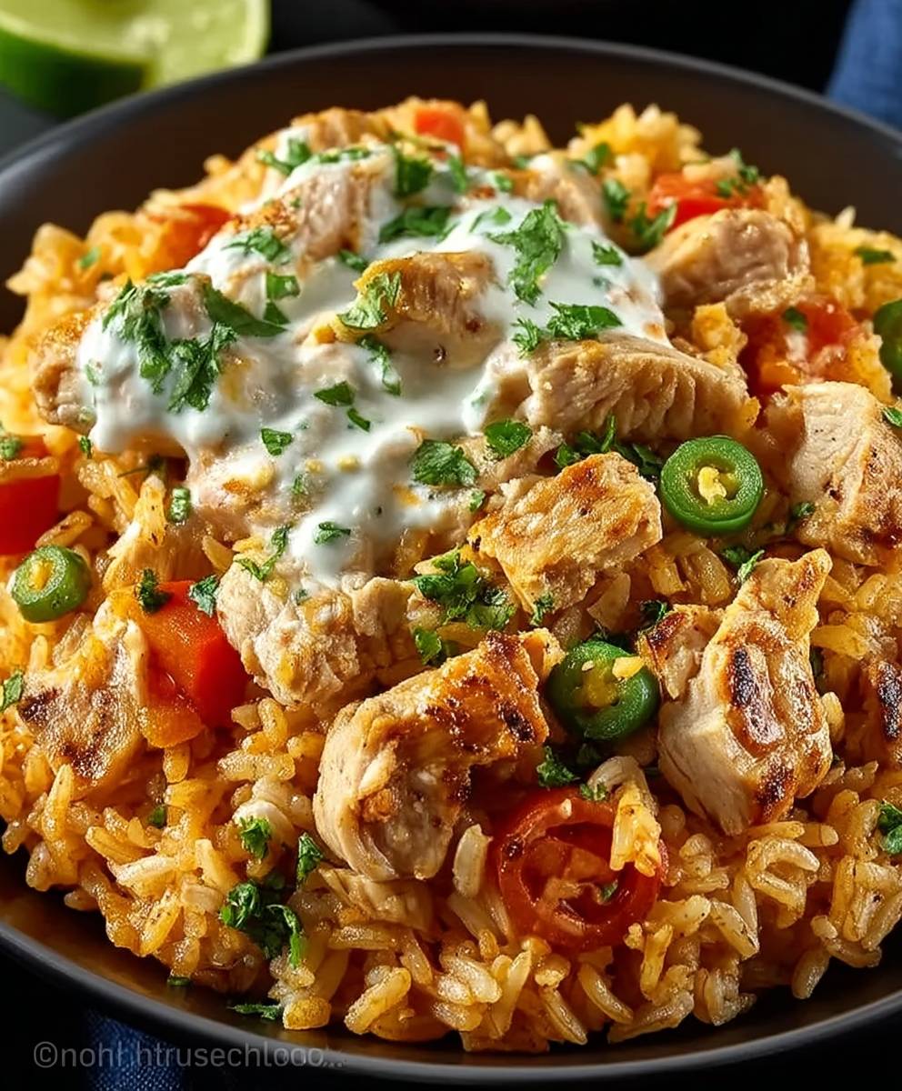 Dive into Pollo Loco! Savory seared chicken thighs meet fluffy rice, infused with aromatic onion, zesty tomatoes, and green chilies, all smothered in rich, creamy queso.